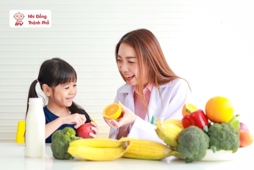 Ba mẹ nên cho trẻ ăn uống cân bằng, tăng cường rau xanh và trái cây tươi.